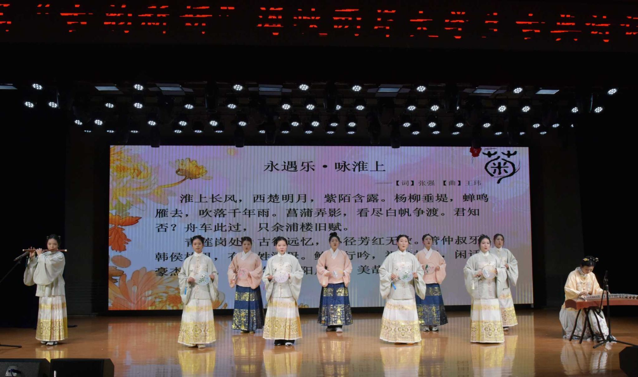 当晚的吟唱展演在新勇学生活动中心学生剧场举行。淮阴师范学院采菊诗社吟唱了《卜算子·咏梅》《清平调三则》与《永遇乐·咏淮上》三首作品。其中,《永遇乐·咏淮上》由张强老师作词、王玮老师作曲,匠心独运地将淮上美景与文化礼赞相融合;《卜算子·咏梅》的古韵与《清平调三则》的现代曲风相映成趣,古筝与笛子合奏旋律婉转清雅,恰如“春风拂槛、露华凝香”。诗社同学以柔美深情的嗓音,娓娓道来“名花倾国两相欢”的绝代风华。三首作品音乐上各具特色,又气韵相连,创新传承了古典诗词精髓,让其真正“活”在当下。活动尾声,全体与会师生齐诵《诗经·小雅·蓼莪》,在古老诗句中凝聚文化认同,深化情感联结。